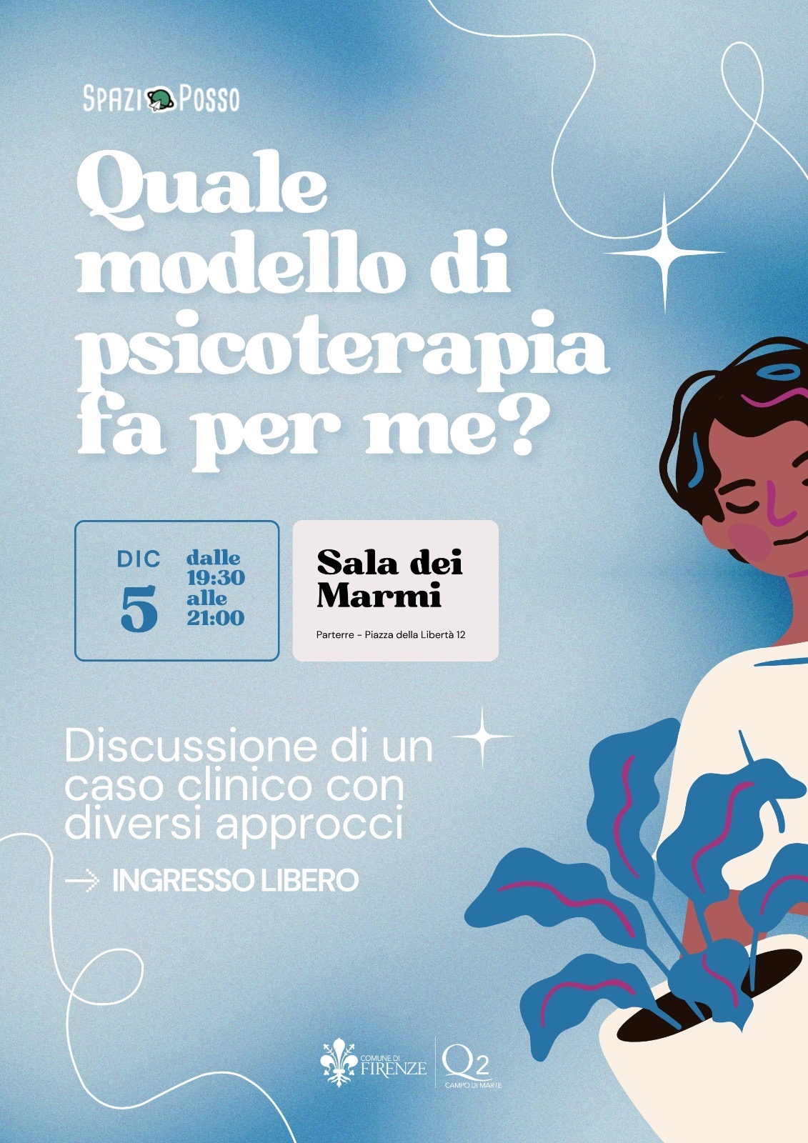 Giovedì 5 dicembre dalle ore 1930 alle ore 21.00, presso la Sala dei Marmi al Parterre in Piazza della Libertà, si terrà l'incontro dal titolo "Quale modello di psicoterapia fa per me? - Discussione di un caso clinico con diversi approcci", a cura di Spazio posso con la collaborazione del Quartiere 2.