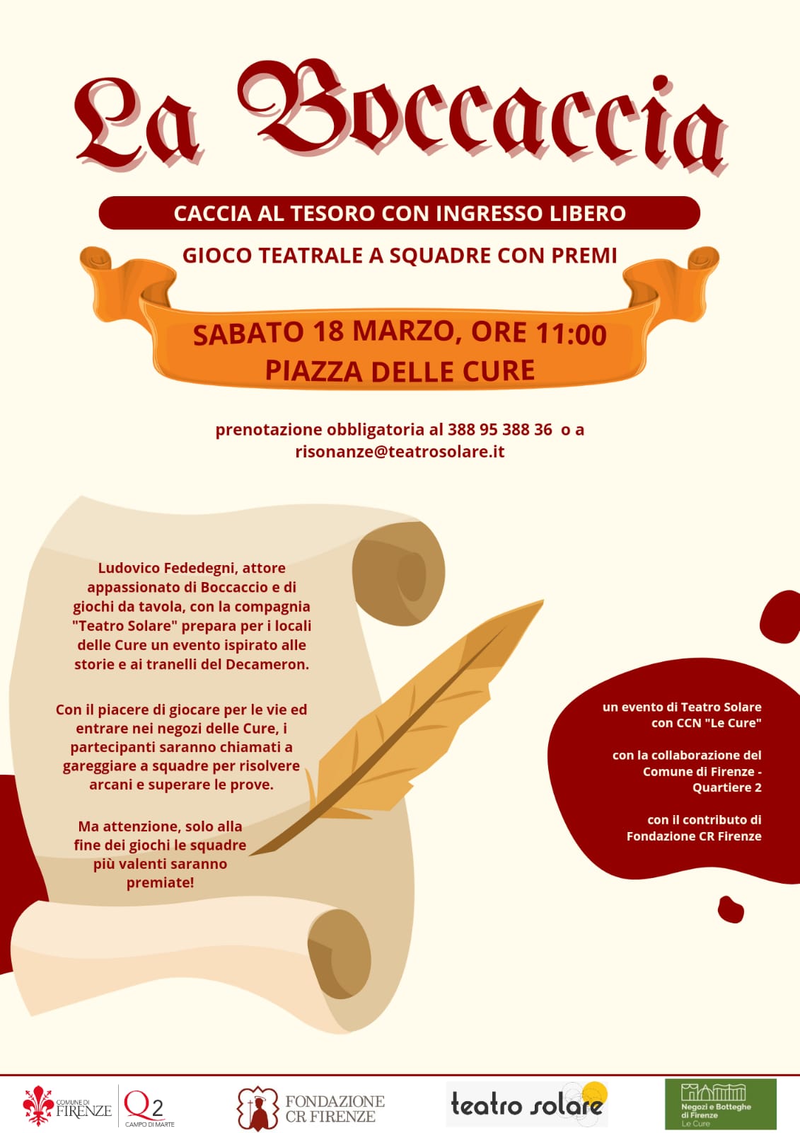 Torna "La Boccaccia", la grande caccia al tesoro a squadre organizzata dall'APS Teatro Solare e dall'attore Ludovico Federgnini con la collaborazione del Quartiere 2 ed il contributo della Fondazione CR Firenze; appuntamento Sabato 18 Marzo alle ore 11.00 in Piazza delle Cure per un evento all'insegna del divertimento, ispirato alle storie e ai tranelli del Decameron.