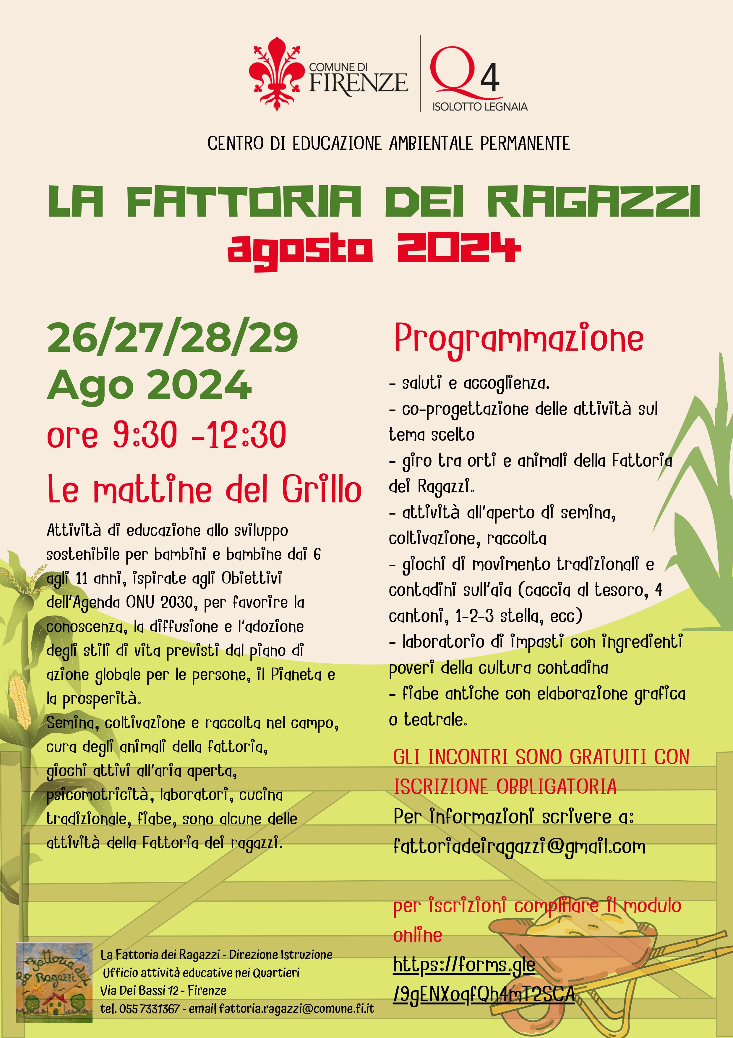 La Fattoria dei Ragazzi invita tutti i bambini e le bambine dai 6 agli 11 anni a partecipare a un'esperienza unica di educazione allo sviluppo sostenibile. Gli incontri, che si terranno il 26, 27, 28 e 29 agosto 2024 dalle ore 9.30 alle 12.30, sono gratuiti e richiedono l'iscrizione obbligatoria.