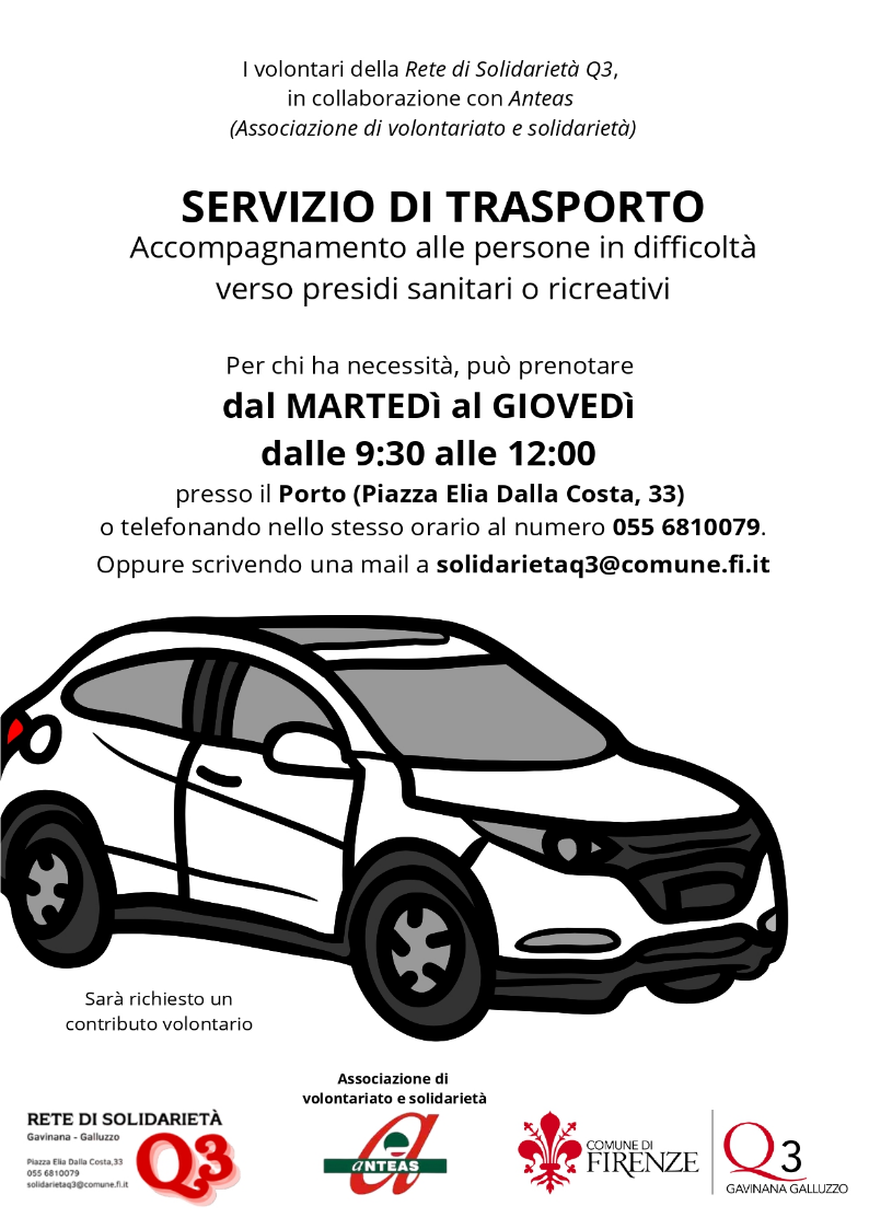 I volontari della Rete di Solidarietà Q3, in collaborazione con Anteas (Associazione di volontariato e solidarietà) forniscono un servizio di trasporto e accompagnamento alle persone in difficoltà verso i presidi sanitari o ricreativi.