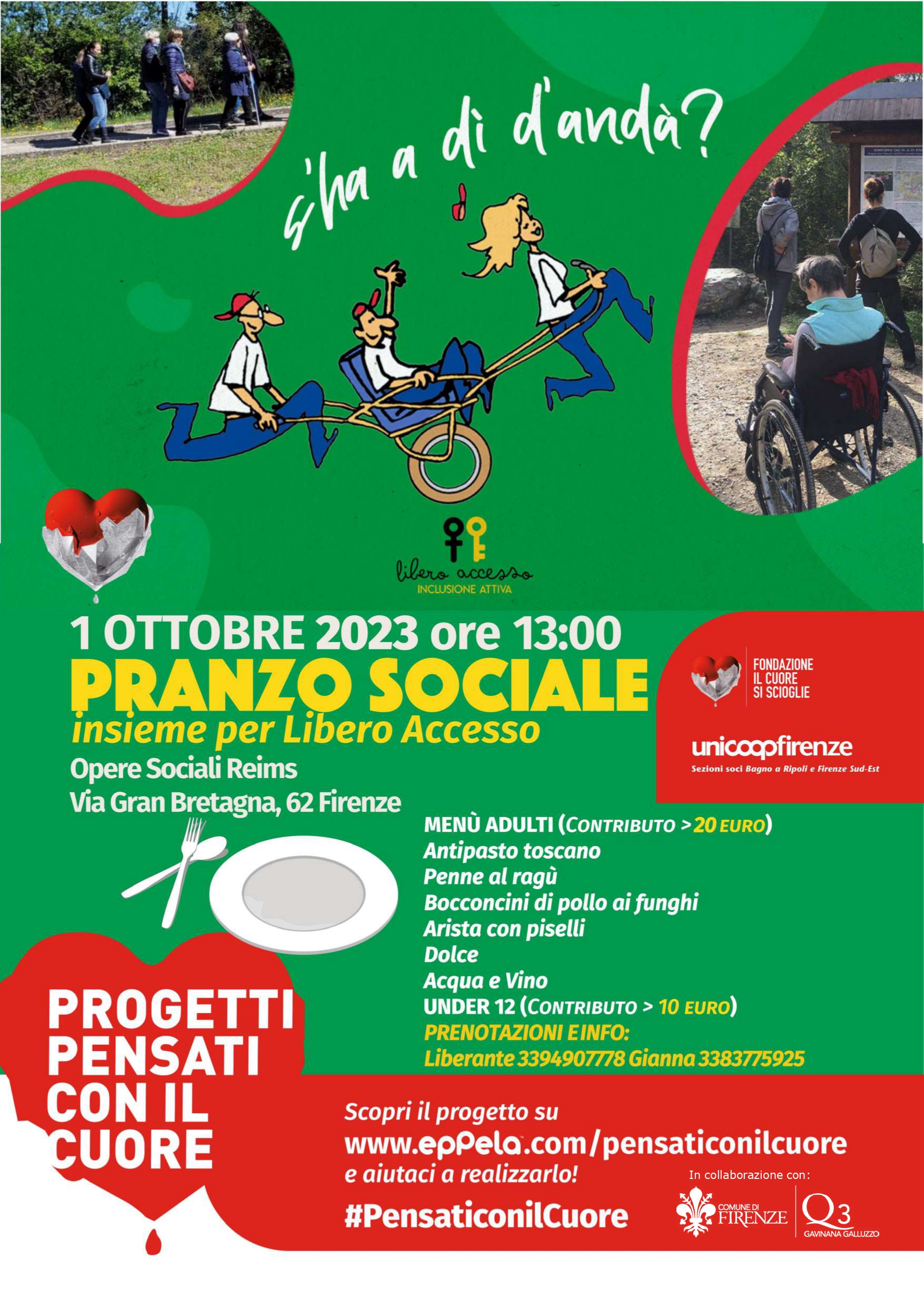 Domenica 1 ottobre 2023 alle ore 13:00 presso la parrocchia del Corpus Domini in via Gran Bretagna, 62 a Firenze, si svolgerà un pranzo sociale per proseguire la raccolta fondi partita il 4 settembre del progetto "S'ha a dì d'andà" dell'Associazione Libero Accesso promosso in collaborazione con la Fondazione Il Cuore Si Scioglie: il progetto si propone di promuovere l’inclusione per far sì che anche persone con disabilità motoria possano fruire delle bellezze naturalistiche del nostro territorio, rendendo il trekking accessibile a tutti. I fondi raccolti verranno utilizzati per finanziare le escursioni accessibili e acquistare una K-Bike, una carrozzina fuoristrada progettata per le escursioni in montagna, dotata di due ruote centrali e di due bracci laterali che garantiscono stabilità e sicurezza durante il percorso, così da consentire anche a persone con disabilità di godere della bellezza della montagna.