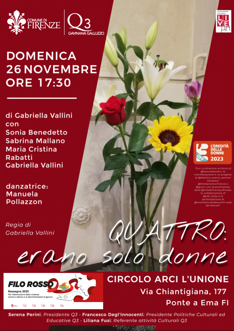 Generazioni diverse di scienziate, politiche, economiste, imprenditrici, attiviste, scrittrici, artiste e ambientaliste per raccontare la contemporaneità nello spettacolo teatrale "Quattro: erano solo donne" attraverso le sue protagoniste, per riscoprire il ruolo che le donne hanno avuto e continuano ad avere nei diversi campi del sapere e della società e contribuire così al progresso e all'eredità che lasceremo alle generazioni future.