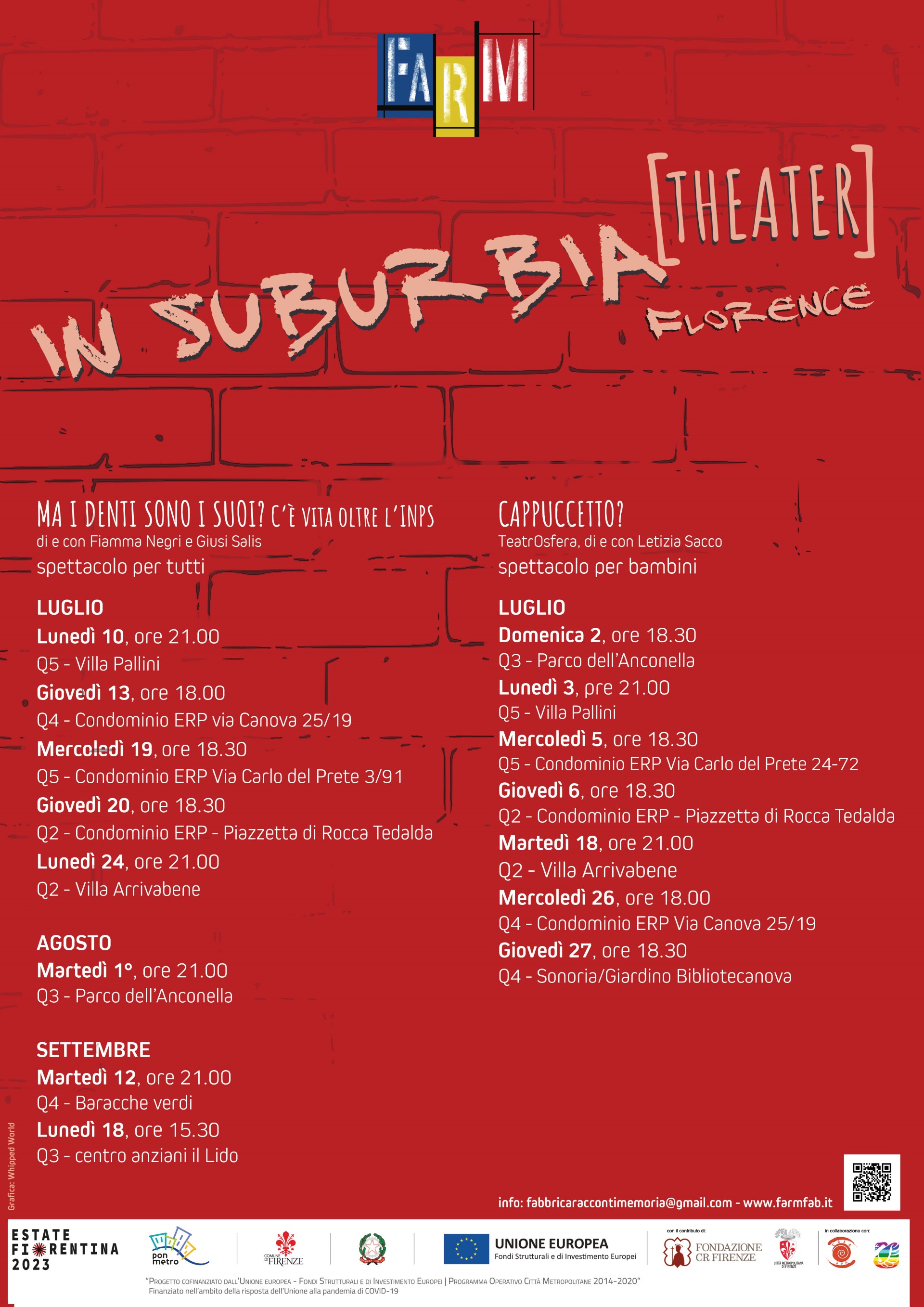 Una rassegna, pensata per garantire un accesso trasversale alla cultura, che trasforma la città in un vero e proprio spazio teatrale: “In Suburbia [theater]”, un progetto di Fa.R.M Fabbrica dei Racconti e della Memoria realizzato con il contributo dell'Estate Fiorentina che porterà nei quartieri di Firenze ben quindici eventi, tutti gratuiti.