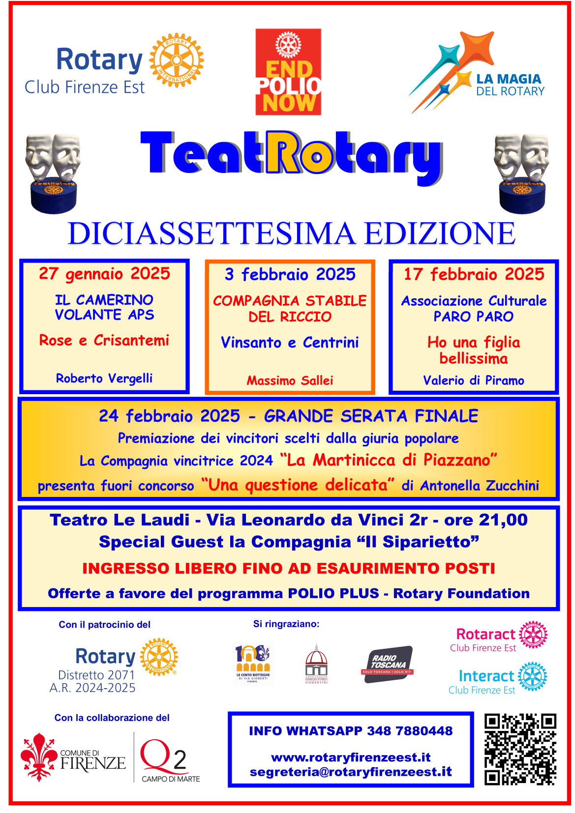 Torna con la diciassettesima edizione "TeatRotary", la rassegna teatrale a cura del Rotary Club Firenze Est a favore della campagna umanitaria globale End Polio Now; quattro serate, quattro compagnie diverse e quattro nuovi spettacoli teatrali, tutti ad ingresso libero fino ad esaurimento posti.