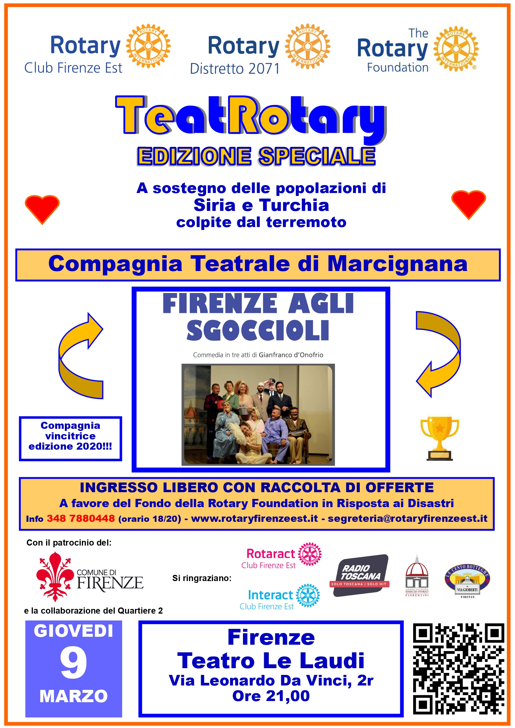 Giovedì 9 Marzo alle ore 21.00, presso il Teatro Le Laudi in Via Leonardo Da Vinci 2r, si terrà lo spettacolo teatrale "Firenze agli sgoccioli", a cura della Compagnia Teatrale di Marcignana con il patrocinio del Comune di Firenze e la collaborazione del Quartiere 2. L'evento sarà ad ingresso libero e gratuito, con la possibilità di effettuare una donazione a favore del fondo della Rotary Foundation in Risposta ai Disastri; per maggiori informazioni consultare il sito www.rotaryfirenzeest.it o contattare la Fondazione tramite telefono al numero 3487880448 e mail all'indirizzo segreteria@rotaryfirenzeest.it.