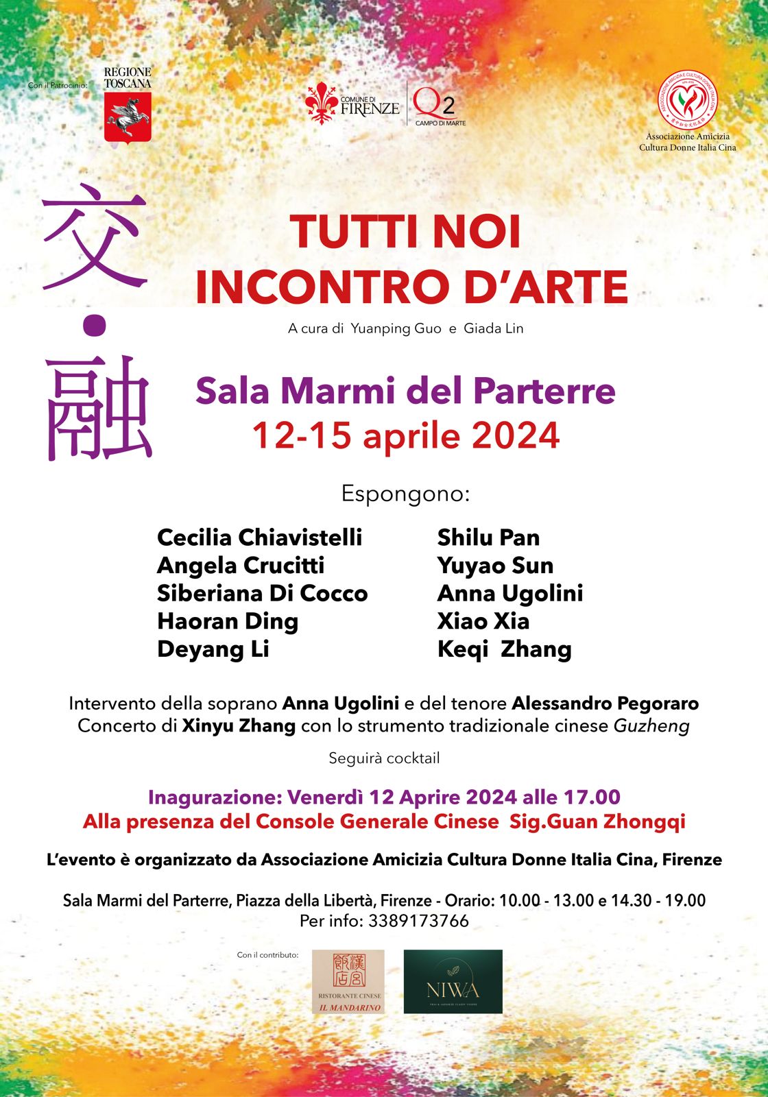 Il 12 Aprile alle ore 17.00, alla Sala dei Marmi al Parterre, si terrà l'inaugurazione della mostra "Tutti noi - Incontro d'arte" a cura dell'Associazione Amicizia Cultura Donne Italia Cina con la collaborazione del Quartiere 2; un'esposizione di opere di artisti italiani e cinesi, alla presenza del Console Generale Cinese Guan Zhongqi e con gli intermezzi musicali del soprano Anna Ugolini, del tenore Alessandro Pegoraro e del musicista Xinyu Zhang.